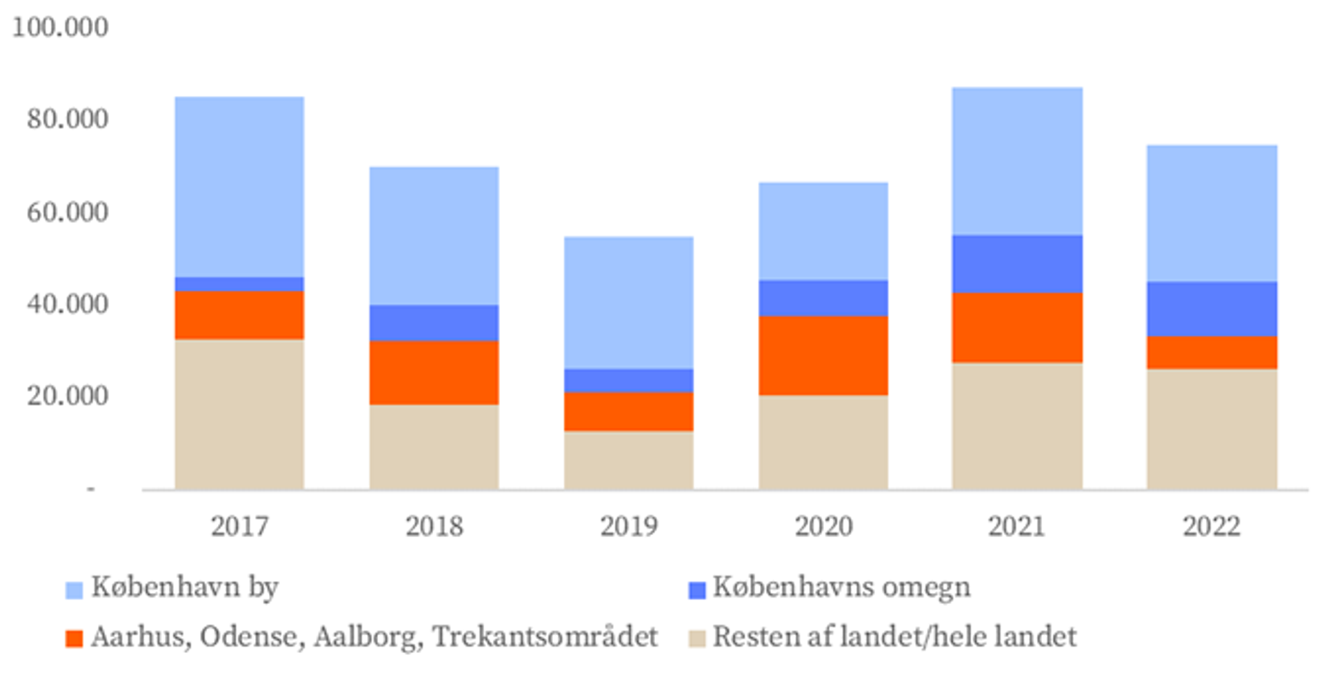 Internationale investorer har øget deres tilstedeværelse på det danske marked i de senere år og stod i 2022 for 59 pct. af den samlede transaktionsværdi. I 2017 var andelen på 18 pct.