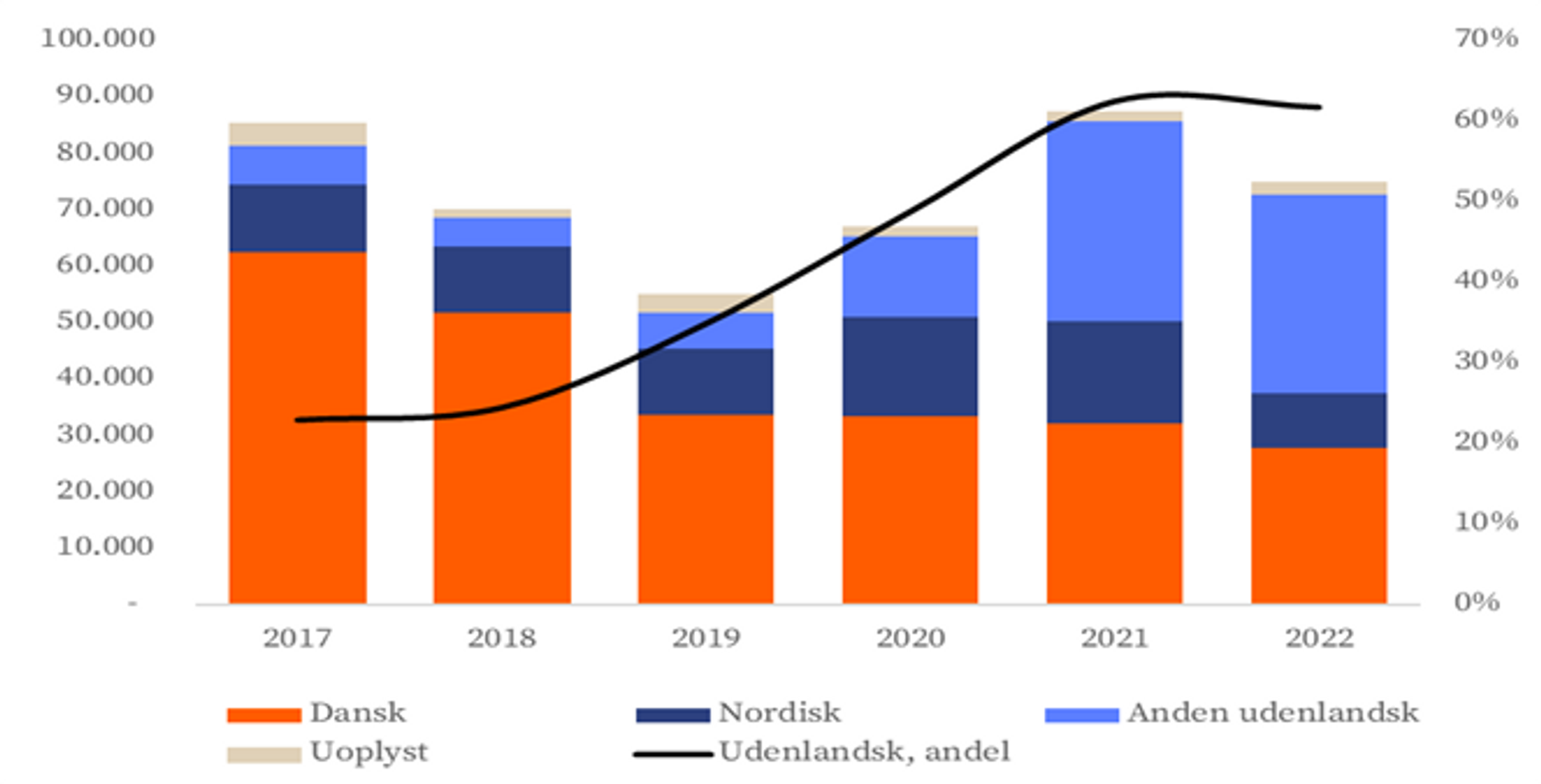 Der er sket en ”internationalisering” af de udenlandske købere. Før 2021 stod nordiske investorer typisk for 50-70 pct. af de udenlandske investeringer. I 2021 var de nordiske køberes andel på 35 pct., og i 2022 var den reduceret til 23 pct.