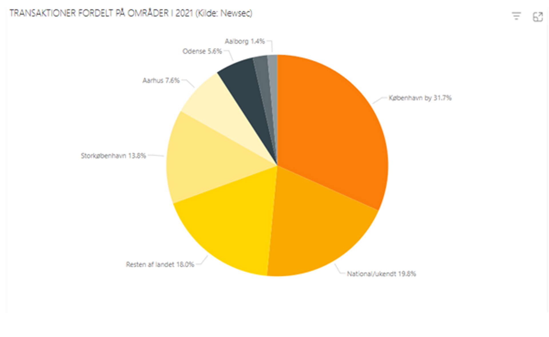Hovedparten af ejendomshandlerne finder sted i landets største byer. Københavnsområdet (København by og Storkøbenhavn) stod for 45 pct. af investeringerne i 2021. Landets andre store byer, Aarhus, Odense og Aalborg samt Trekantområdet, tiltrak sammenlagt 17 pct. af investeringerne. Halvdelen af de store transaktioner over 100 mio. kr. lå i Københavnsområdet.