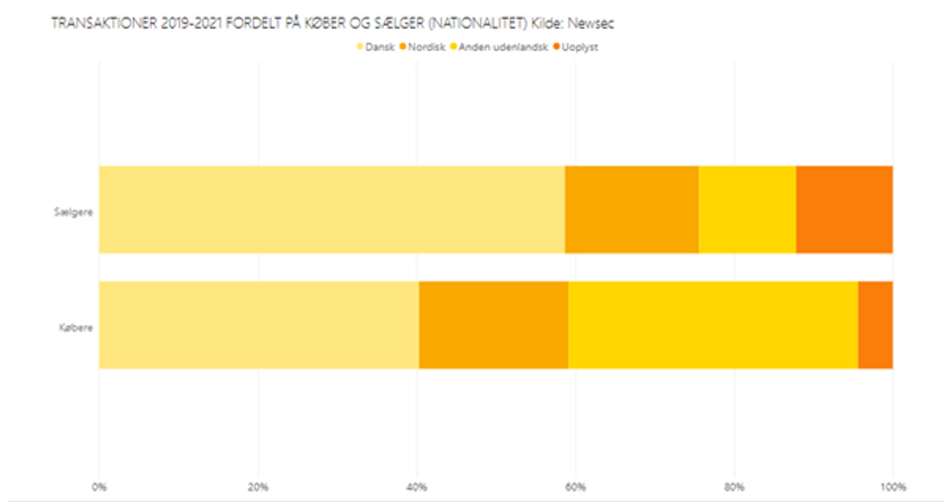 Udviklingen i 2021 viser, at der er sket en klar forøgelse i de udenlandske investorers tilstedeværelse på det danske ejendomsmarked. I 2020 stod de bag 44 pct. af investeringerne, og i 2019 var andelen 32 pct.