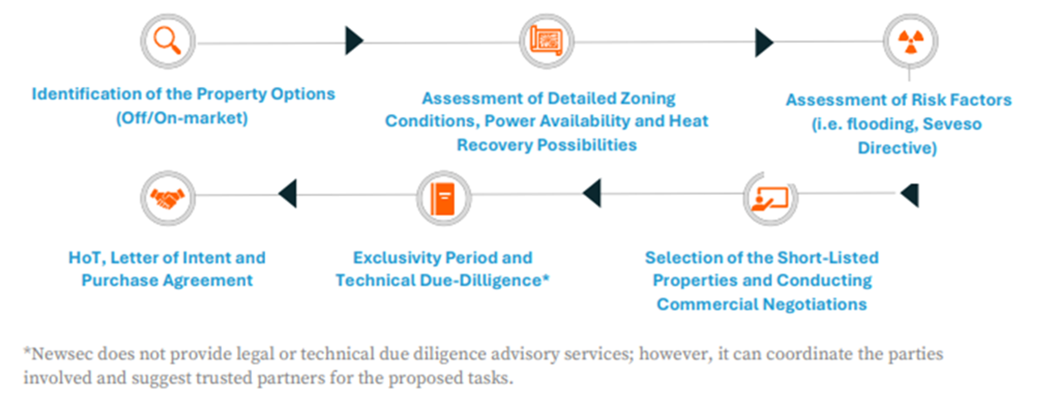 - Identifikation og evaluering af placering: Vi udpeger områder, der opfylder de tekniske, kommercielle og lovgivningsmæssige krav til udvikling af datacentre.